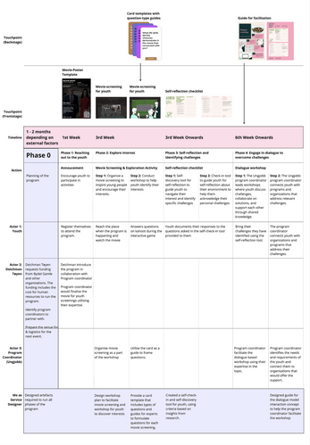 It was also tested with an expert from UngJobb, where each step of the service design concept was presented on a screen and supported by artefacts for each concept, providing a close approximation of facilitating the service.